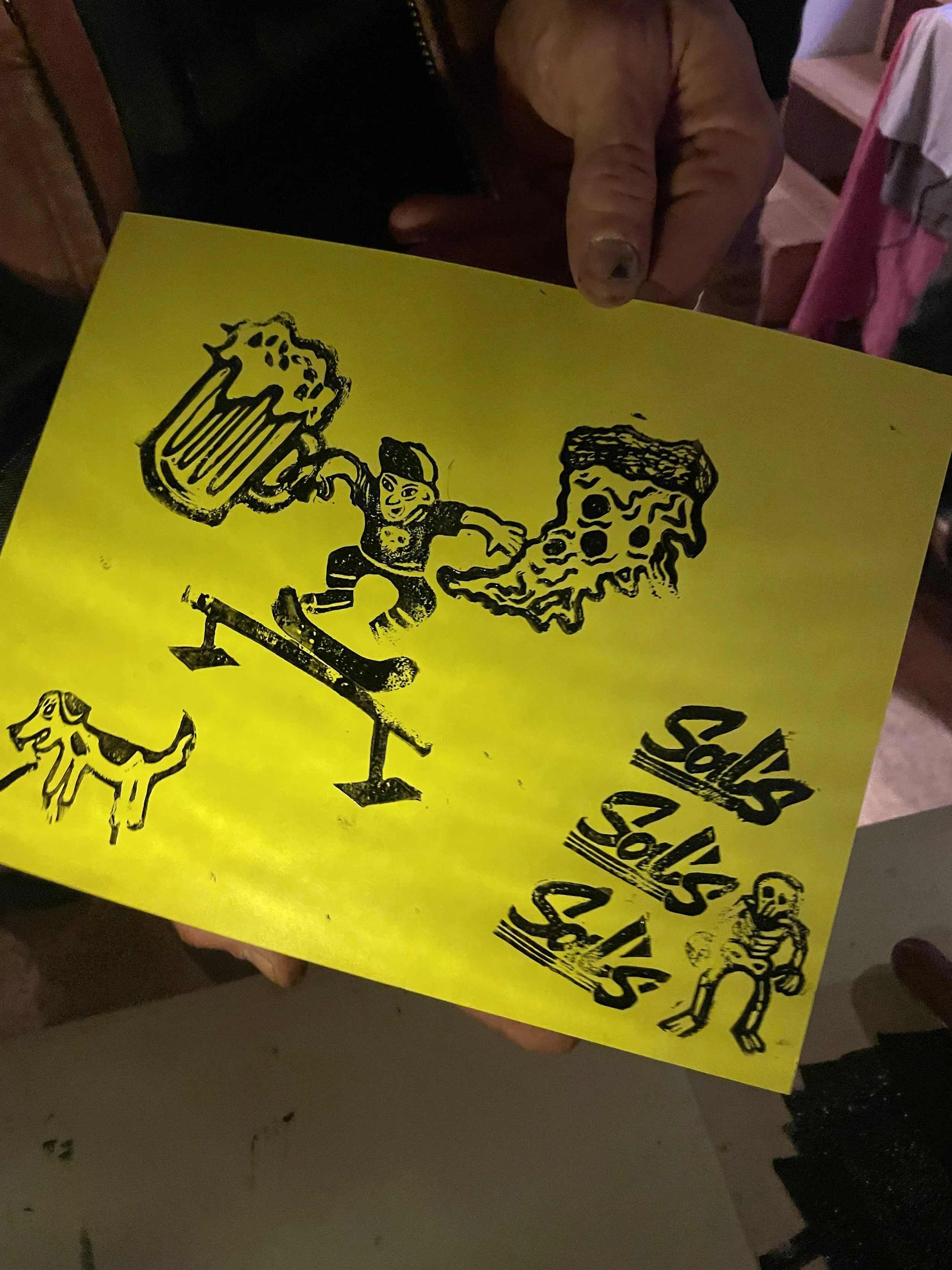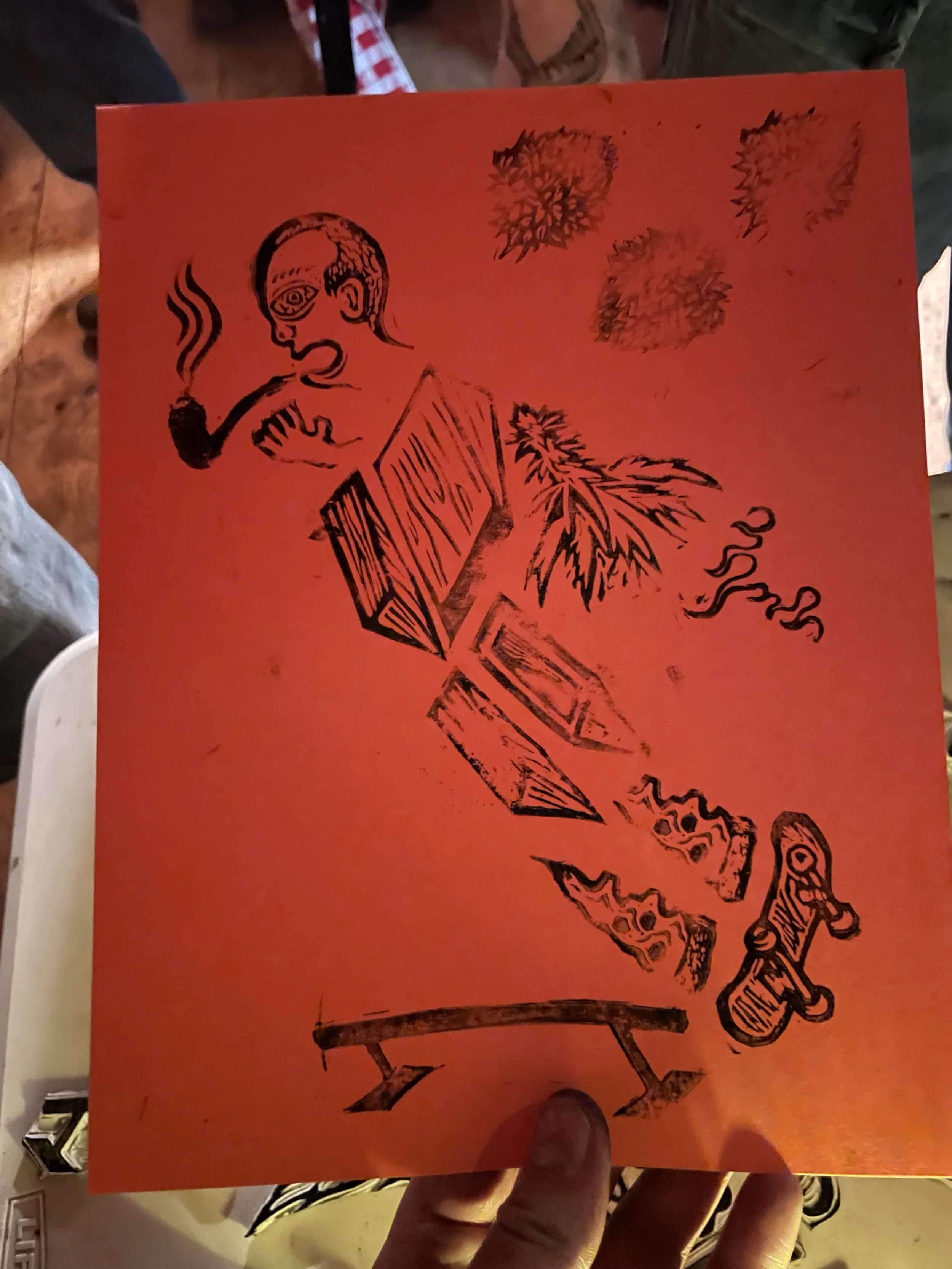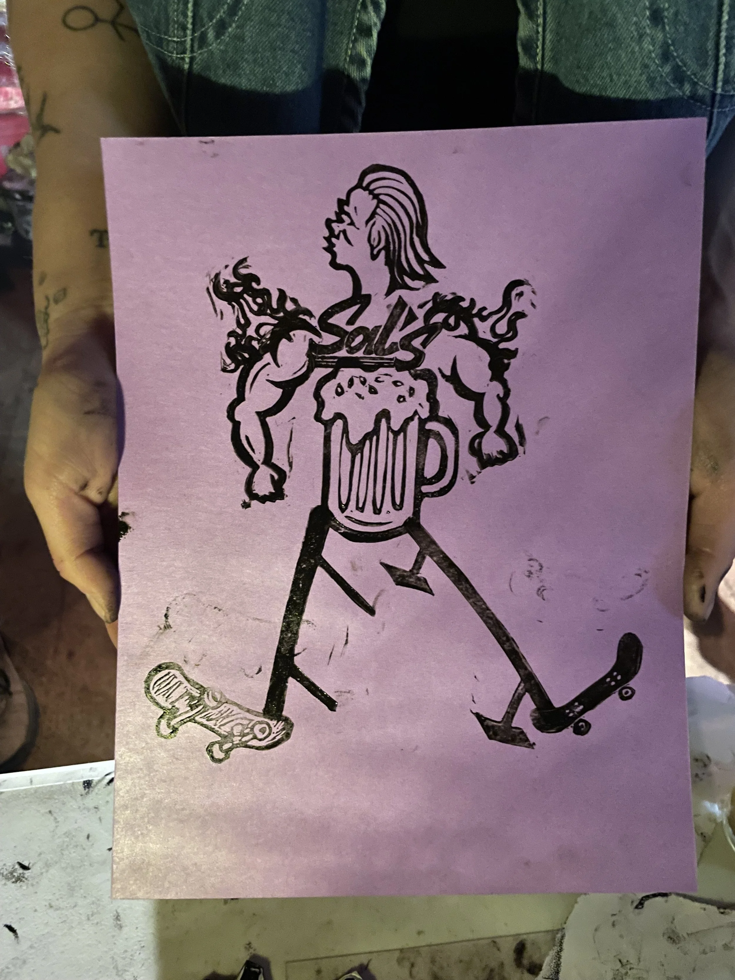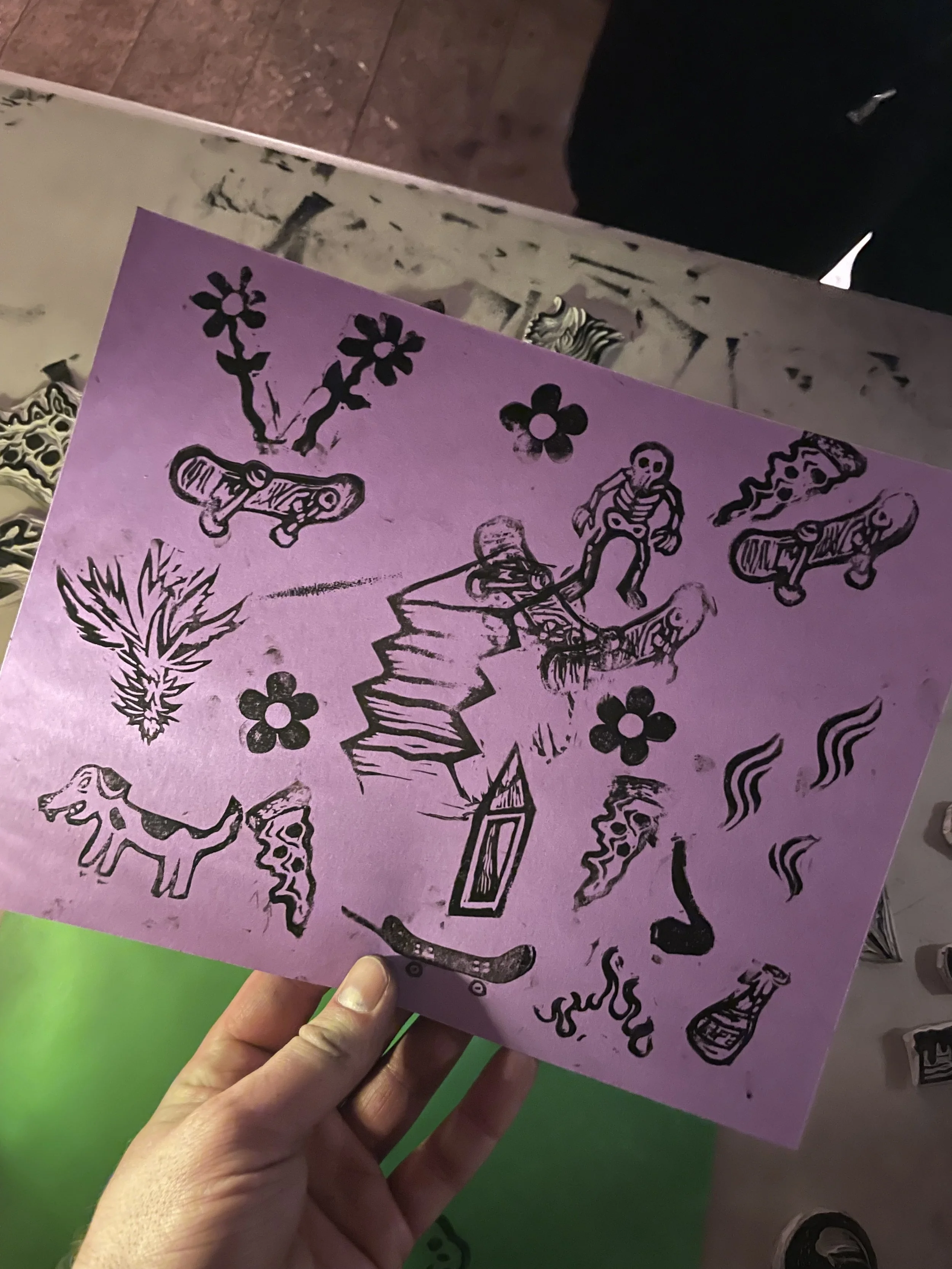 In this workshop hosted at Oxbow Beer Garden in Oxford, Maine, participants chose from a selection of skateboarding themed hand carved stamps by James Sylvester to create skatepark monoprints.
