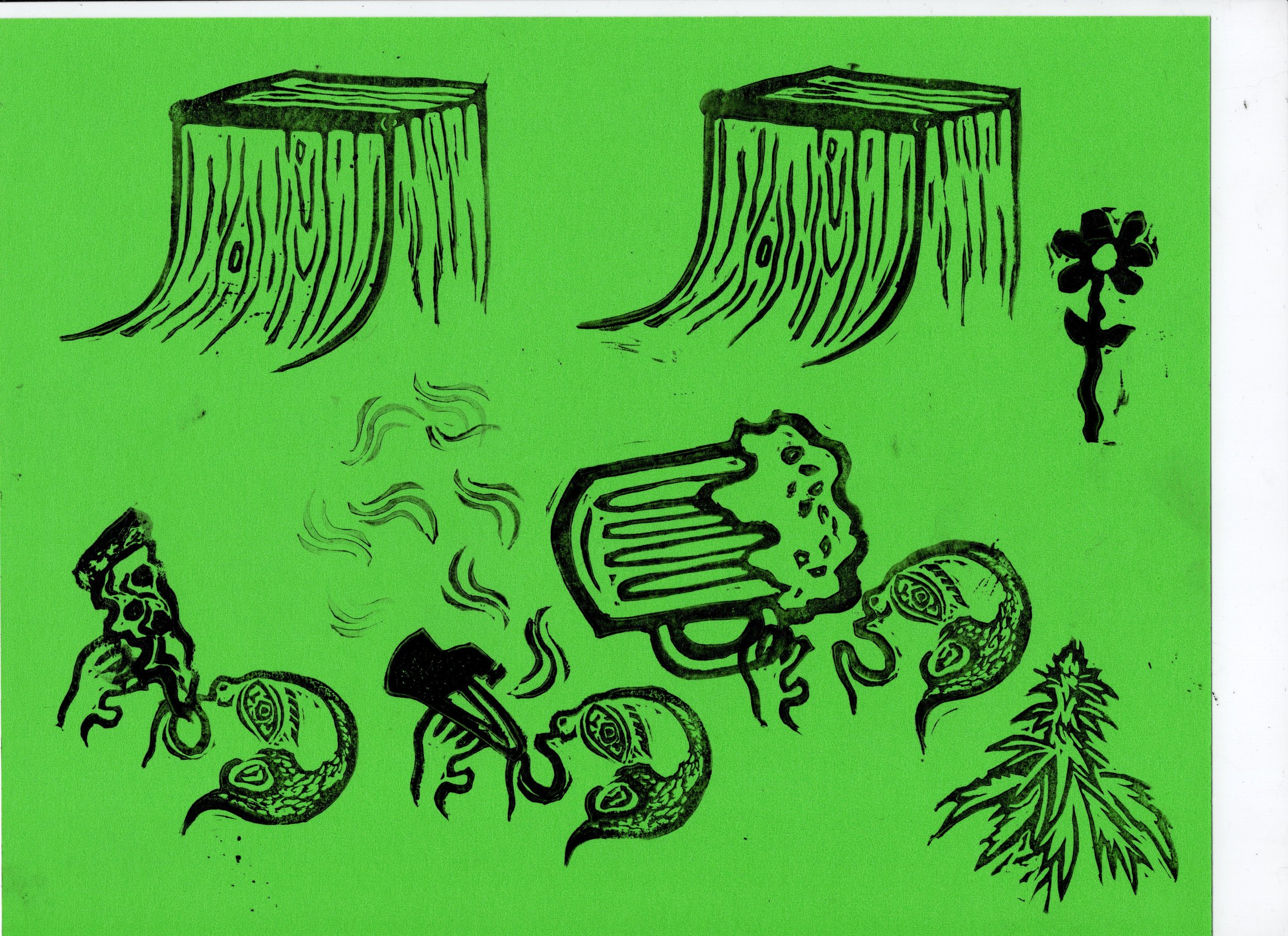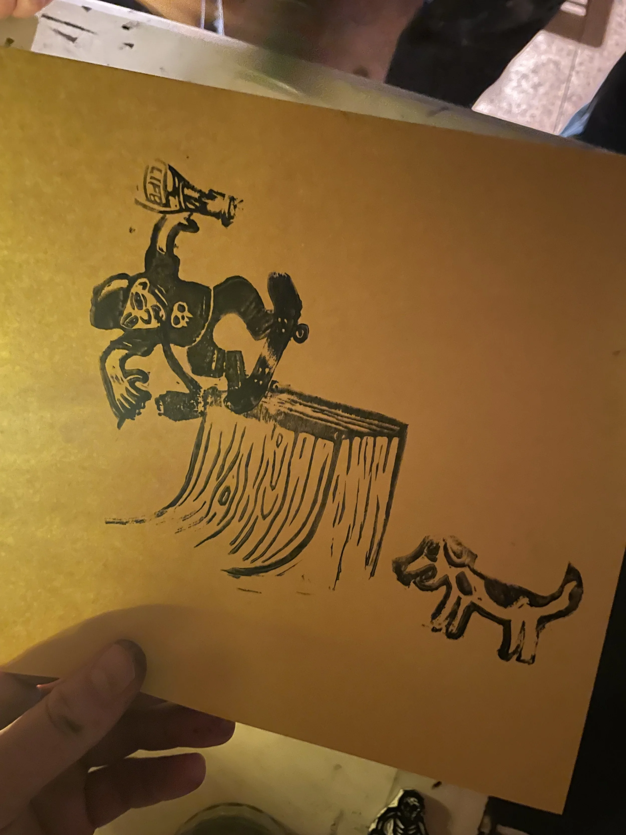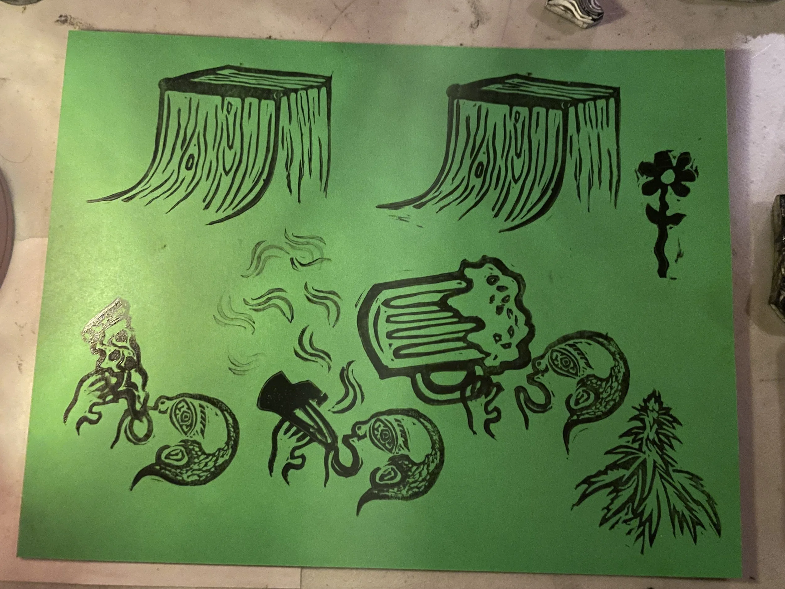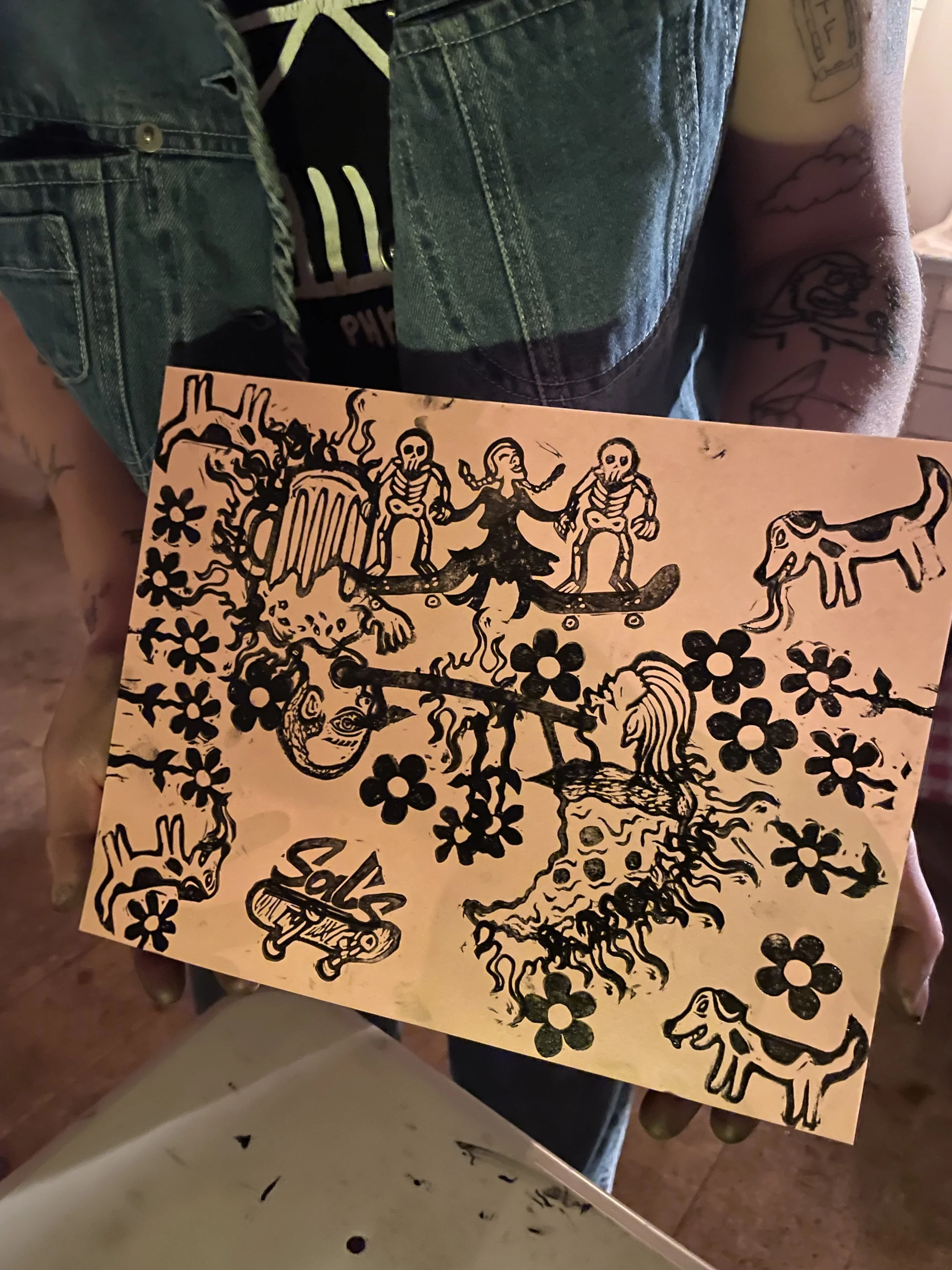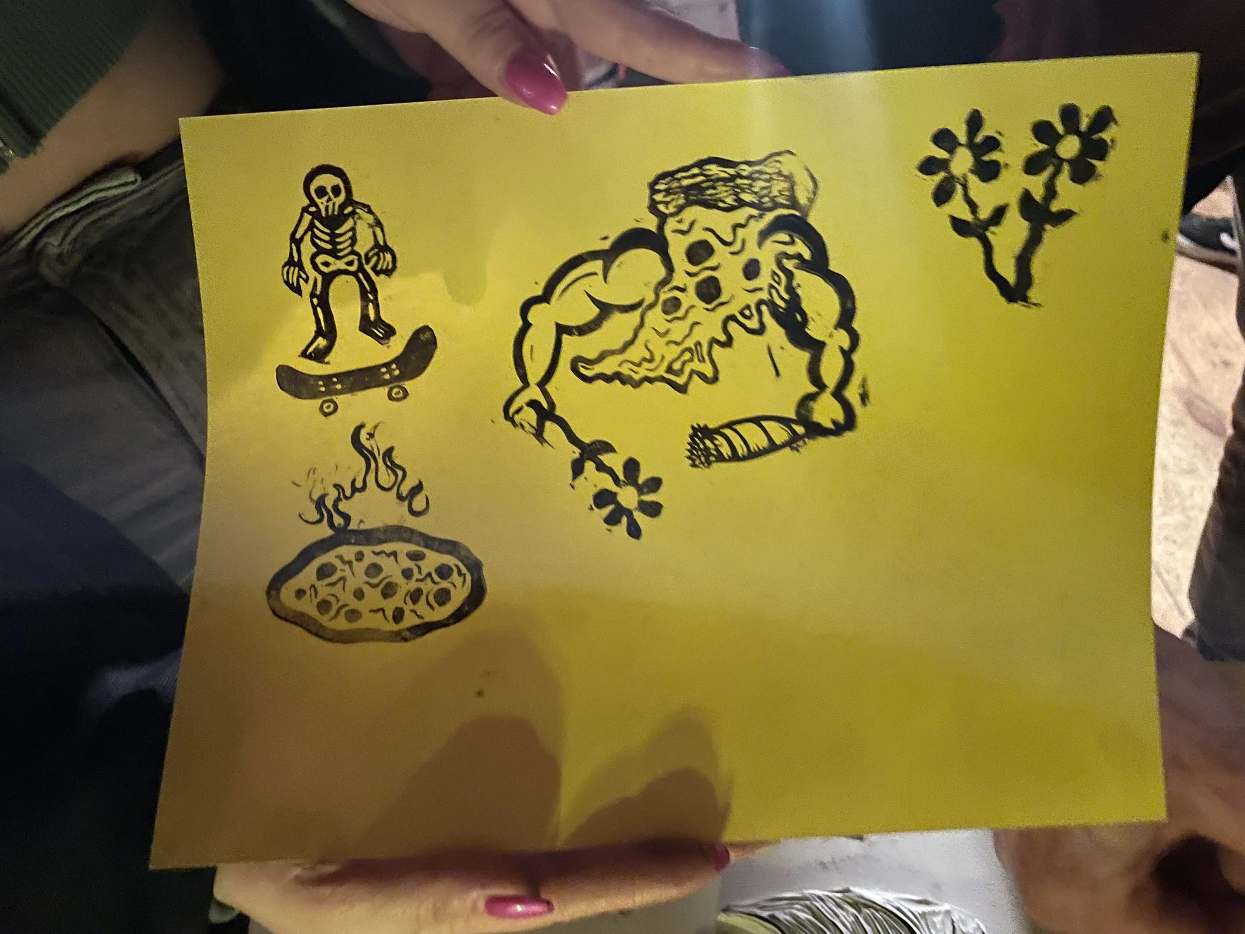 In this workshop hosted at Oxbow Beer Garden in Oxford, Maine, participants chose from a selection of skateboarding themed hand carved stamps by James Sylvester to create skatepark monoprints.
