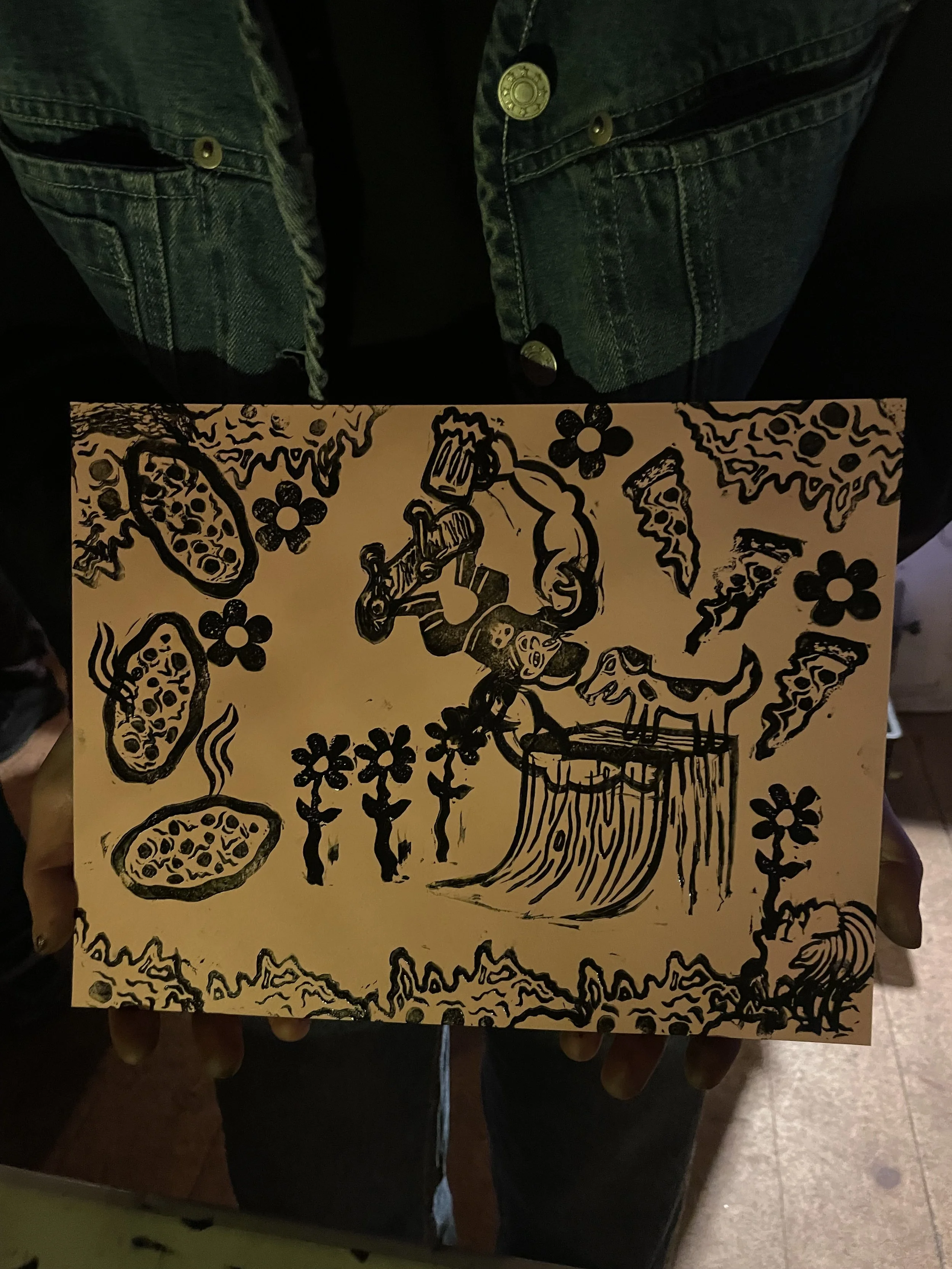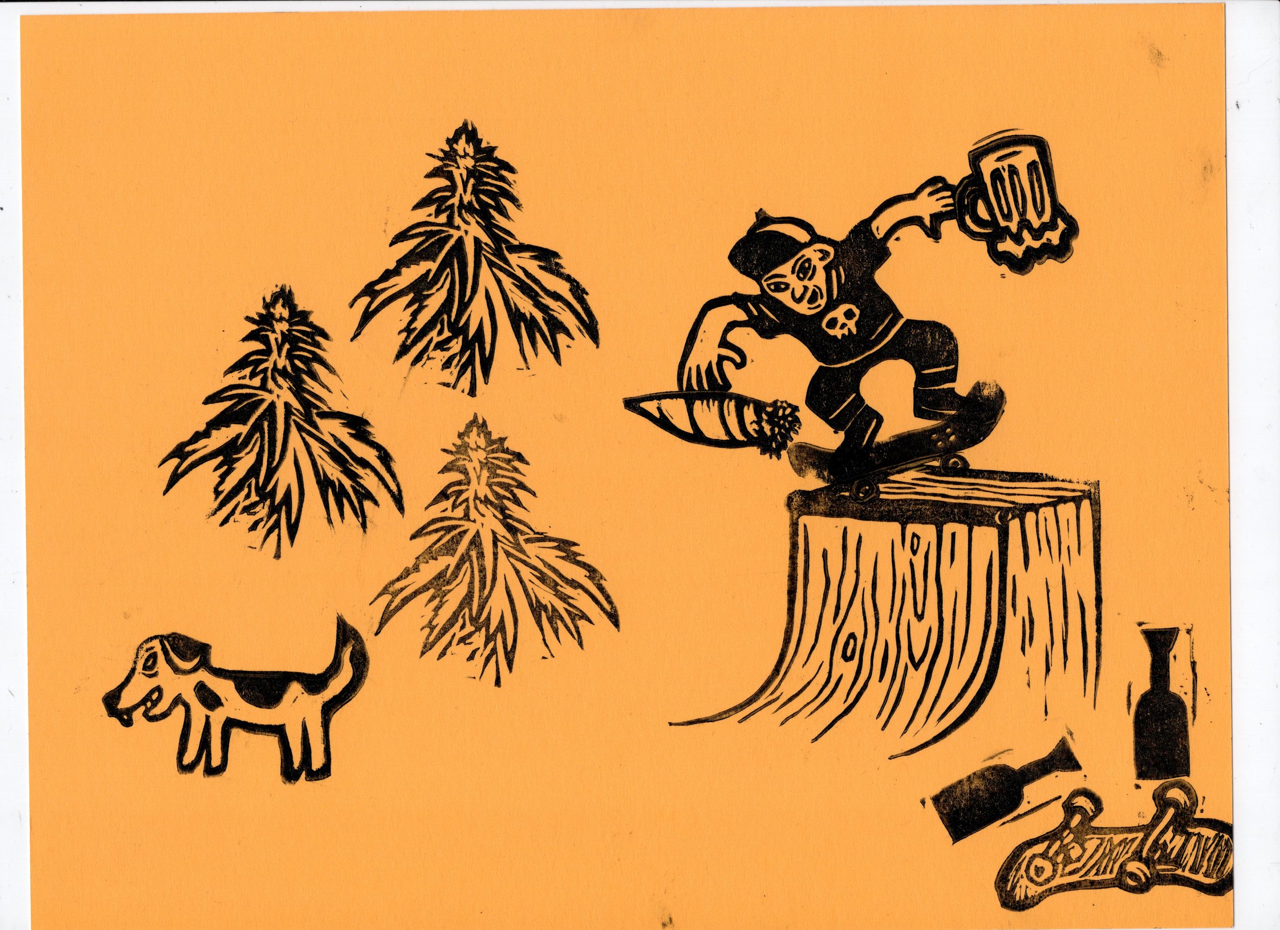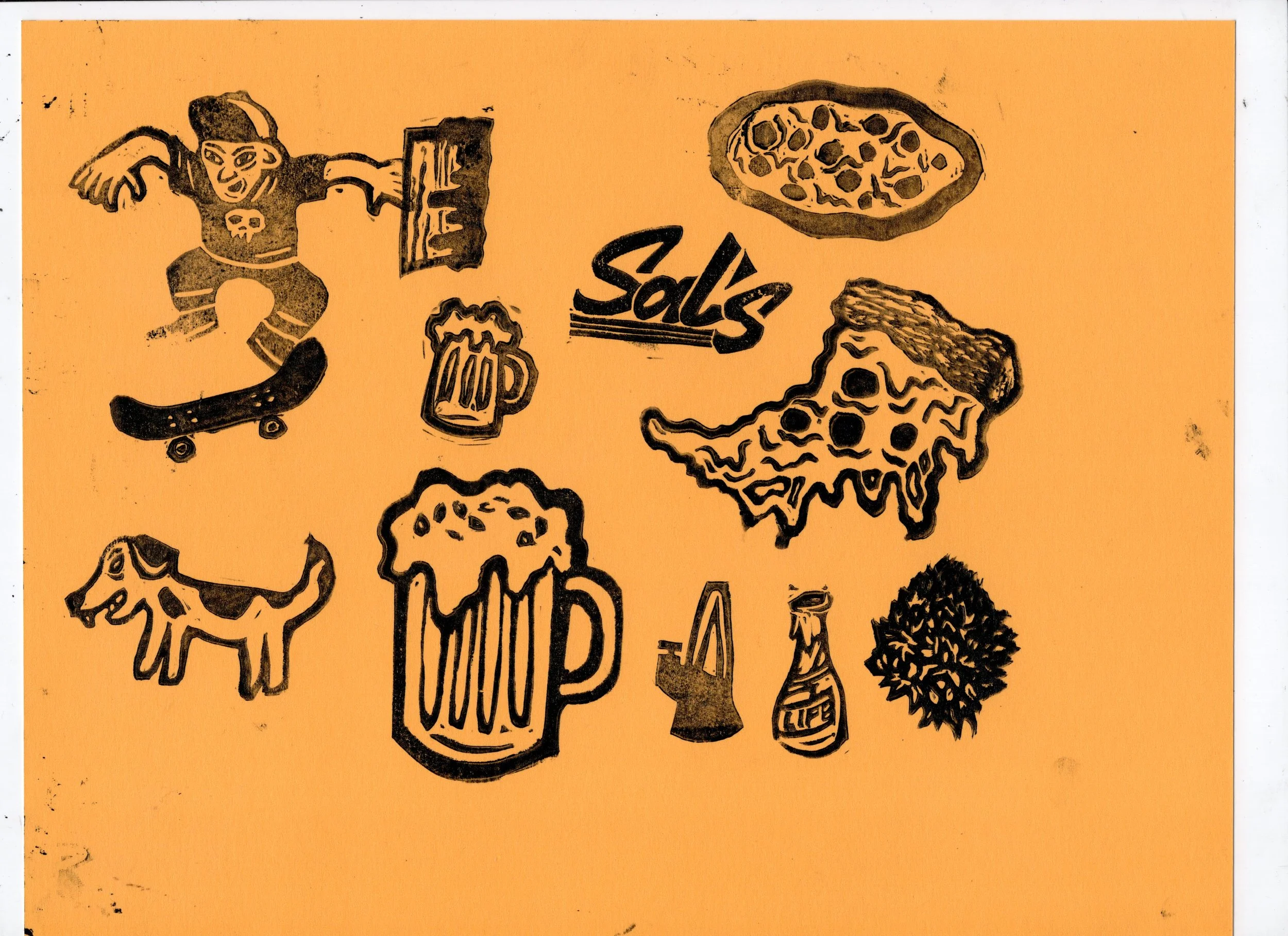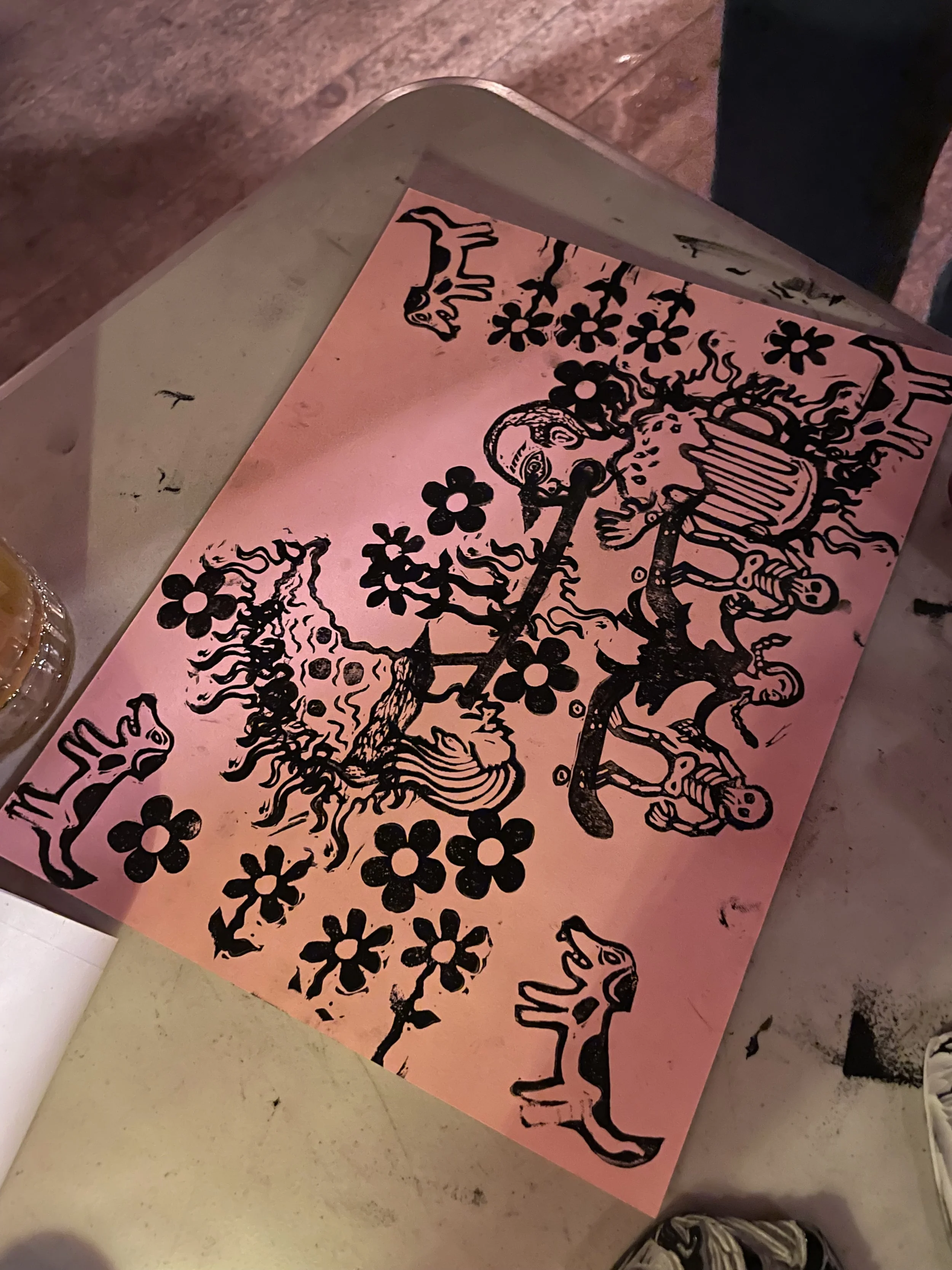 In this workshop hosted at Oxbow Beer Garden in Oxford, Maine, participants chose from a selection of skateboarding themed hand carved stamps by James Sylvester to create skatepark monoprints.