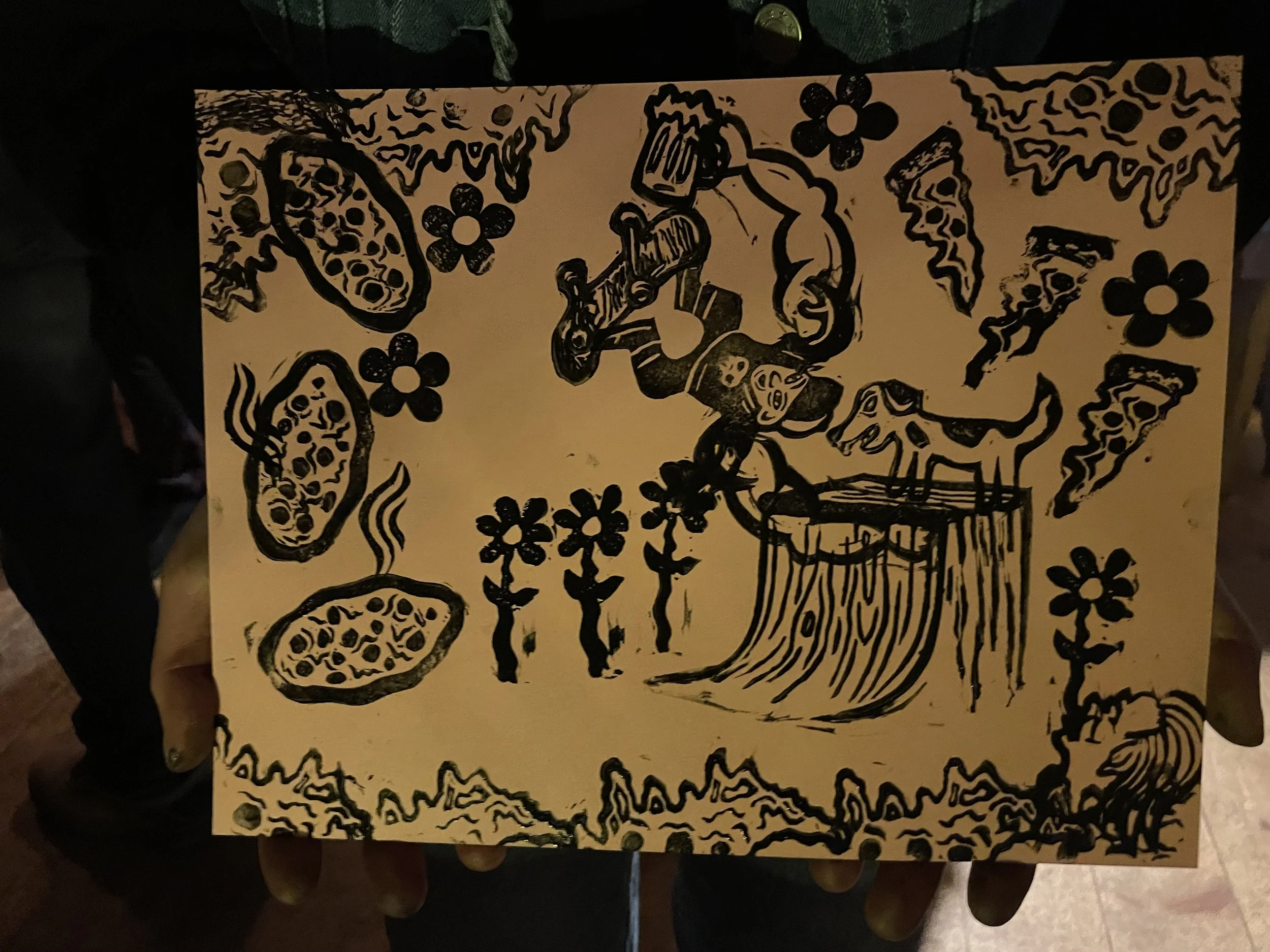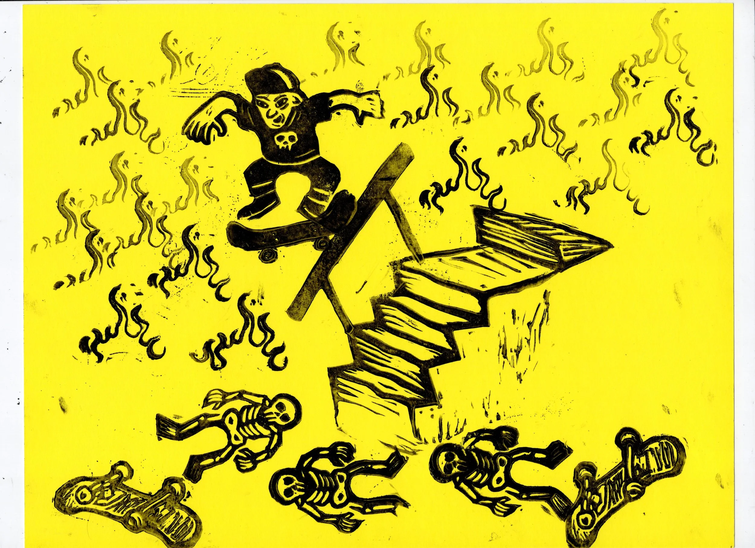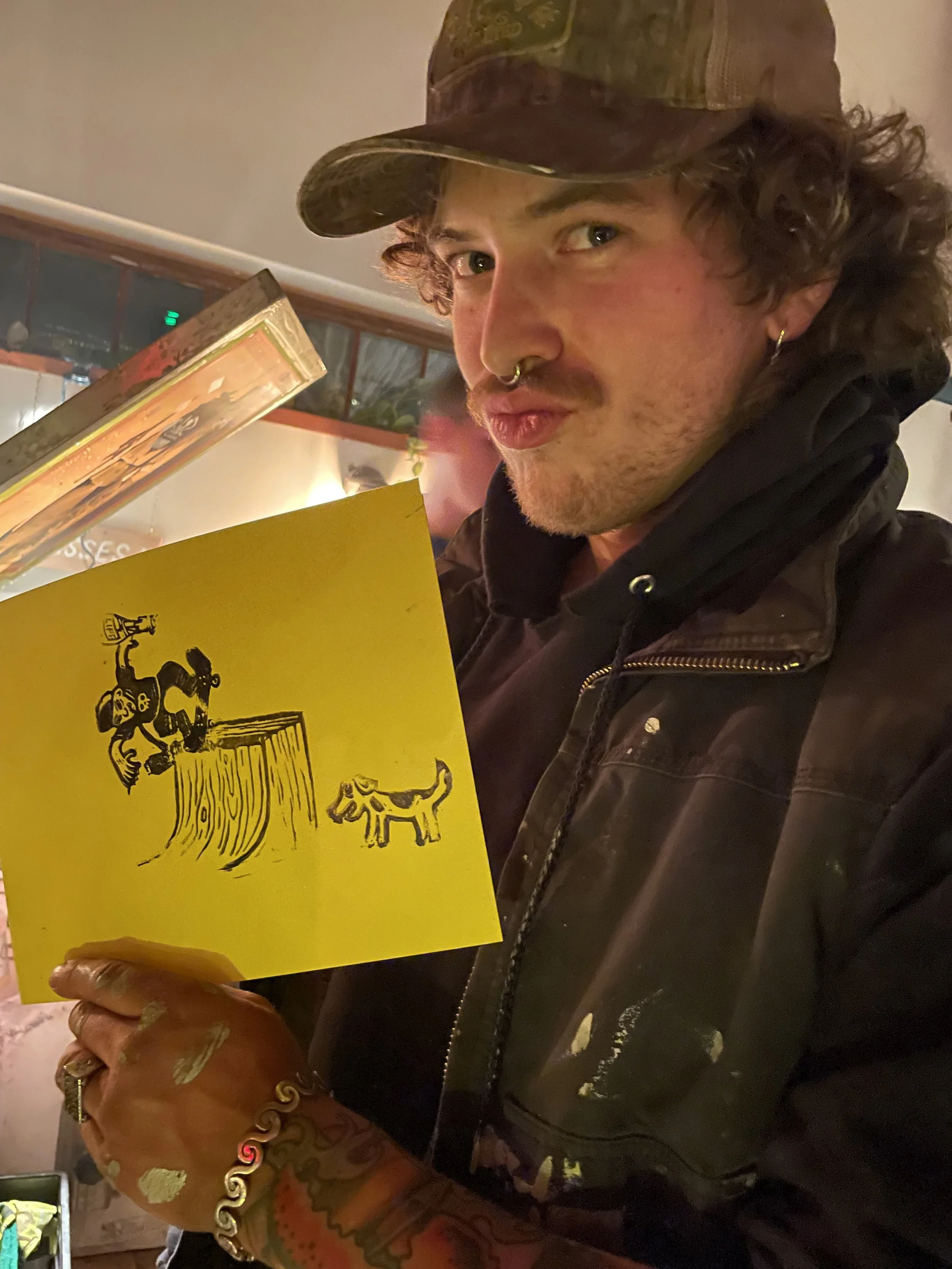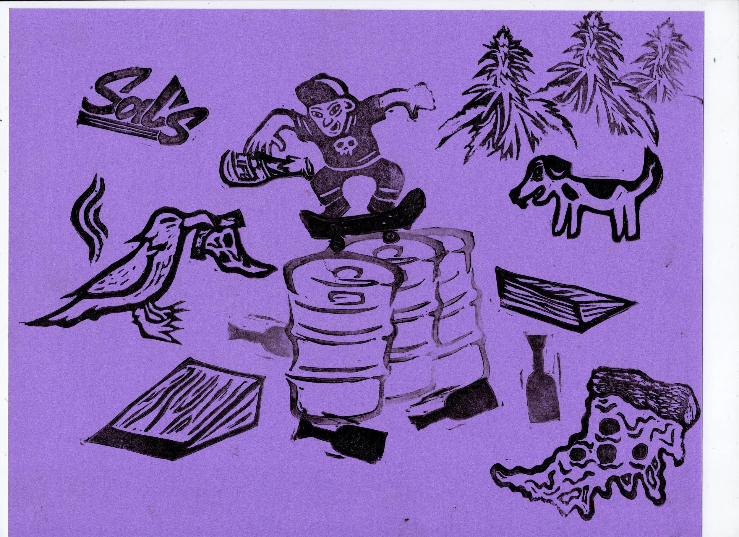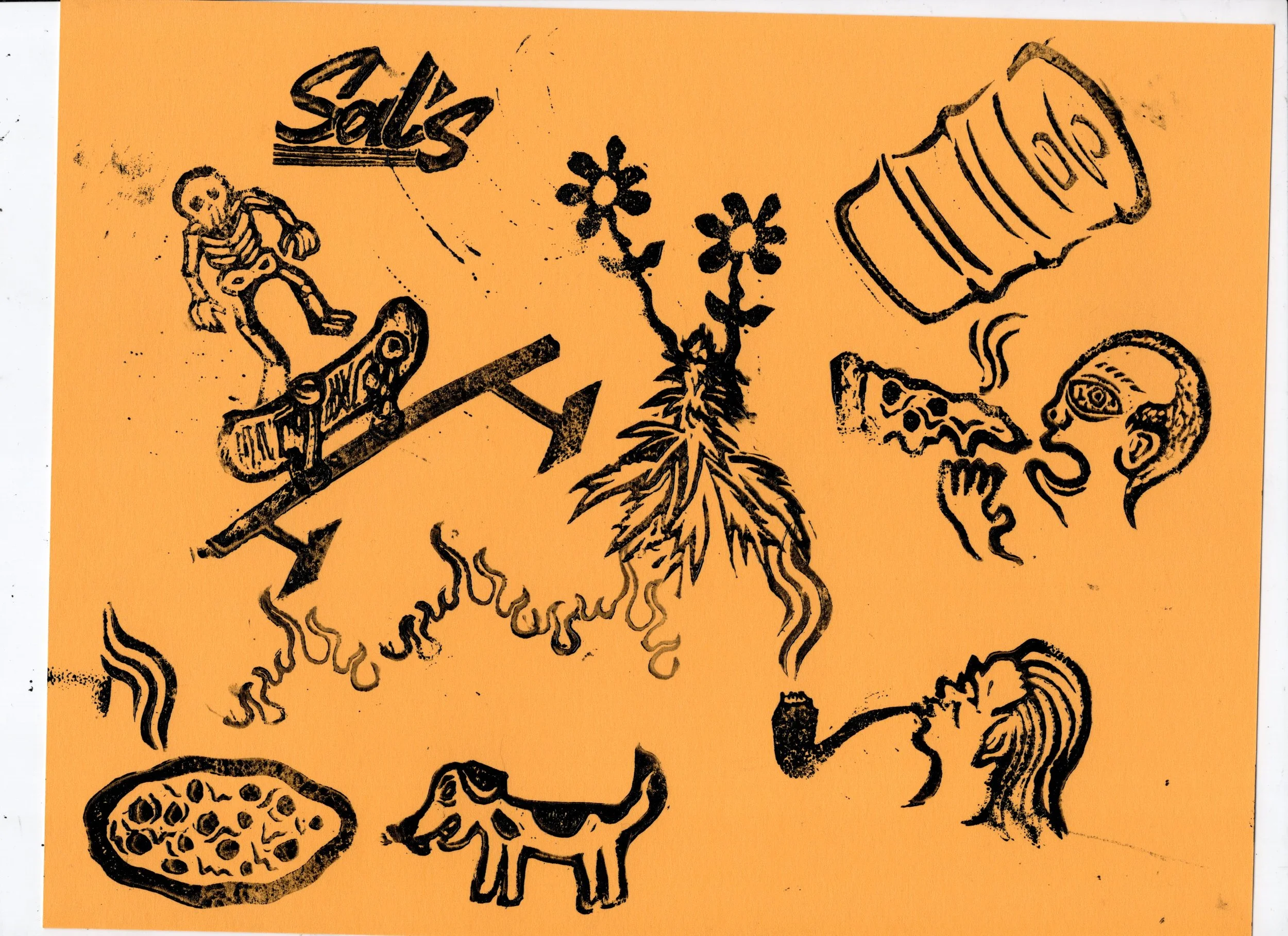 In this workshop hosted at Oxbow Beer Garden in Oxford, Maine, participants chose from a selection of skateboarding themed hand carved stamps by James Sylvester to create skatepark monoprints.
