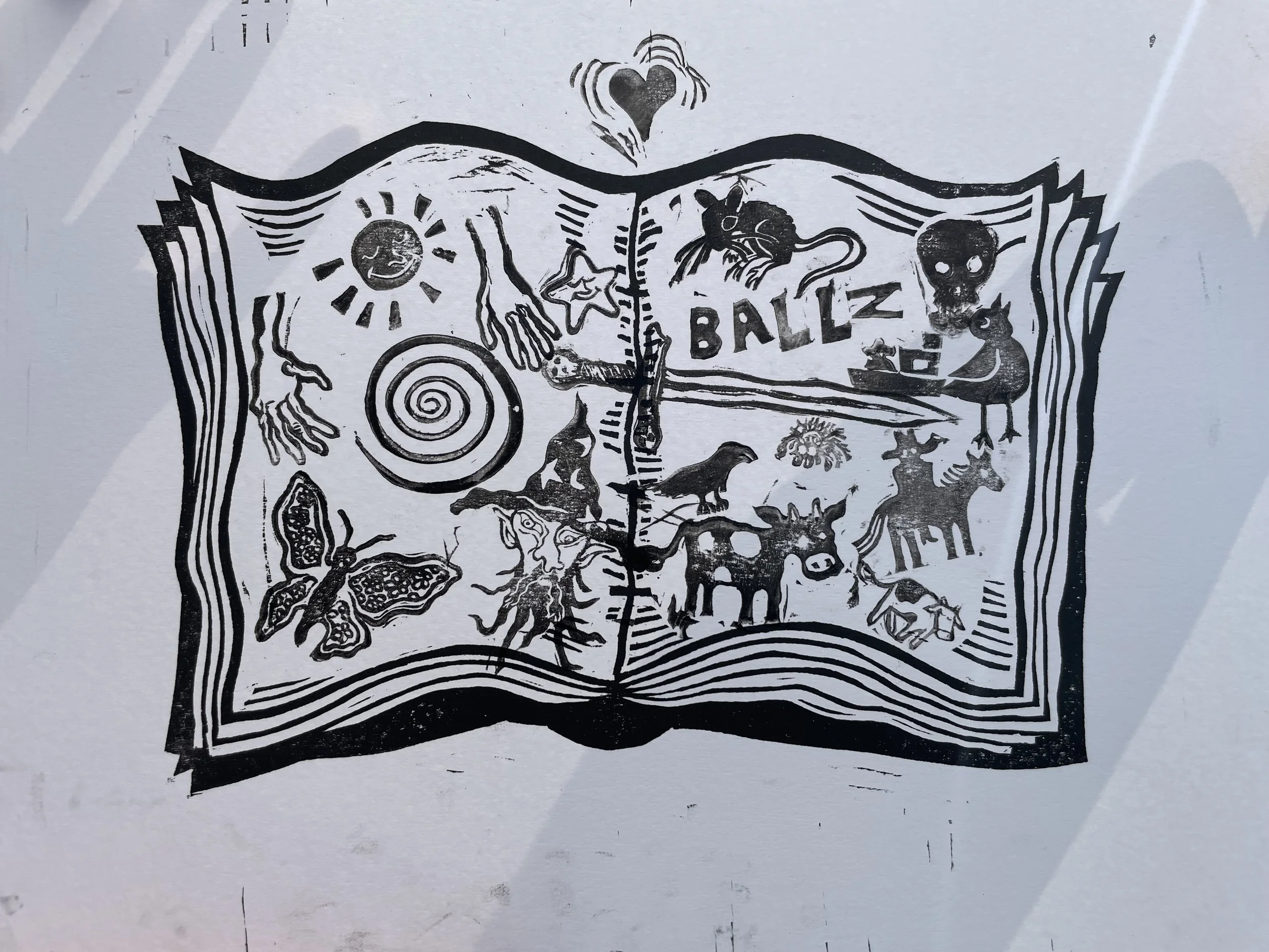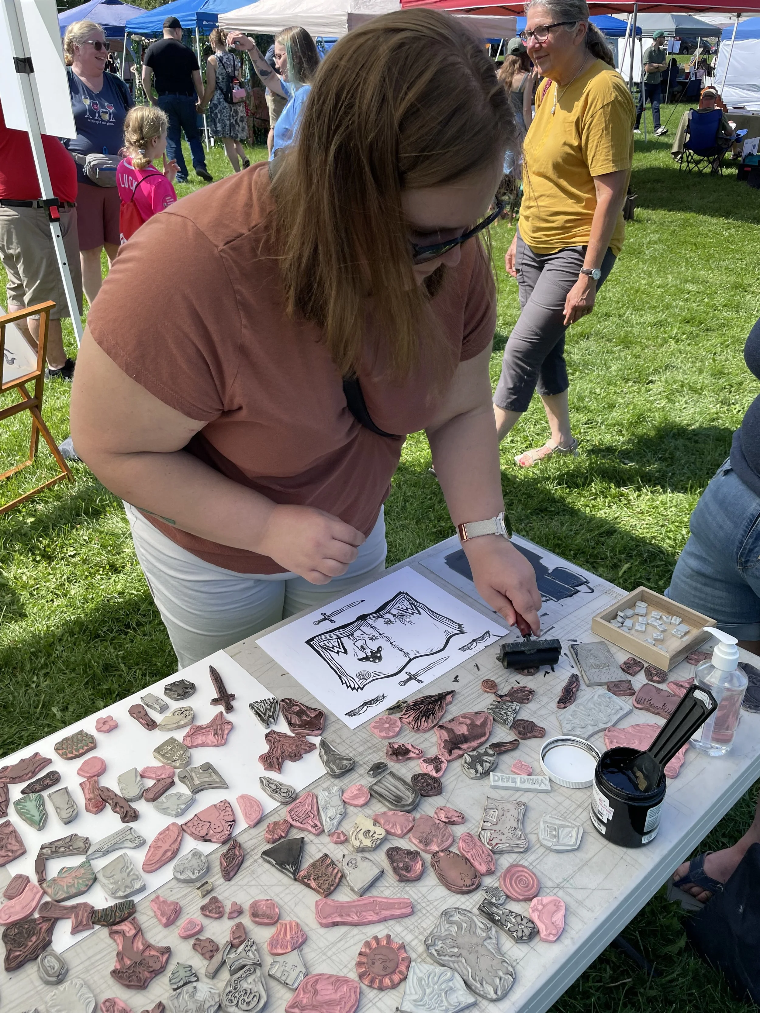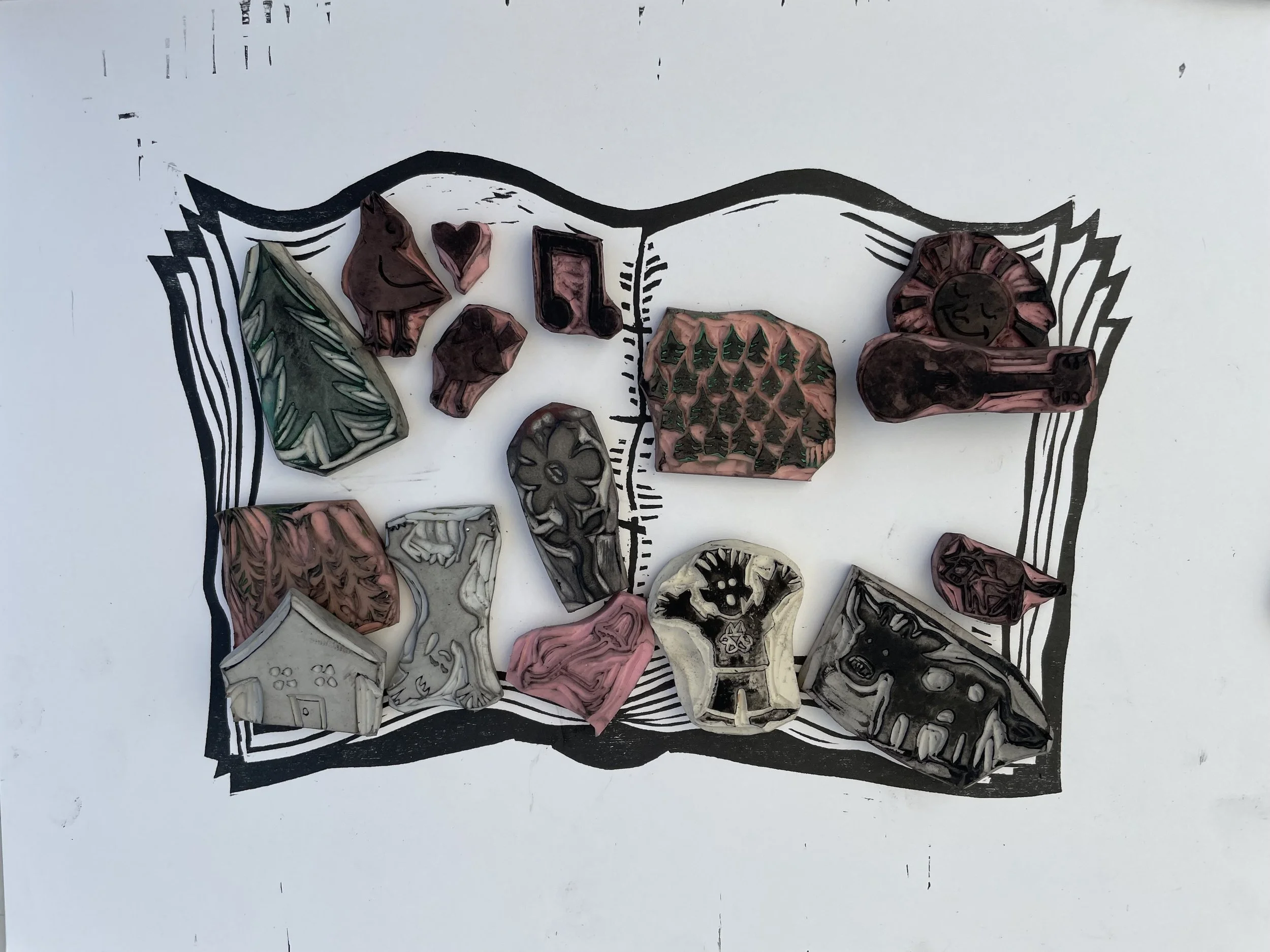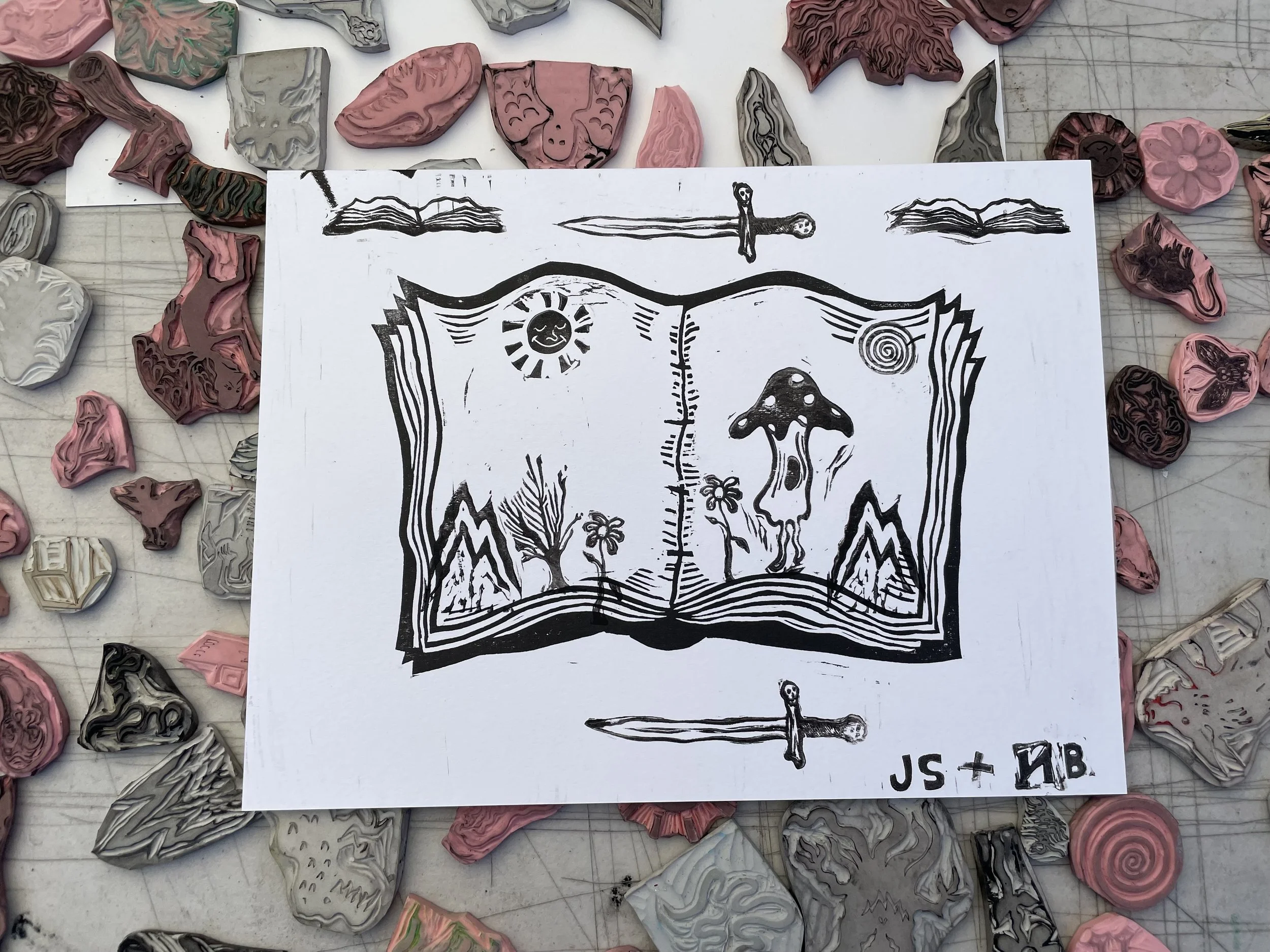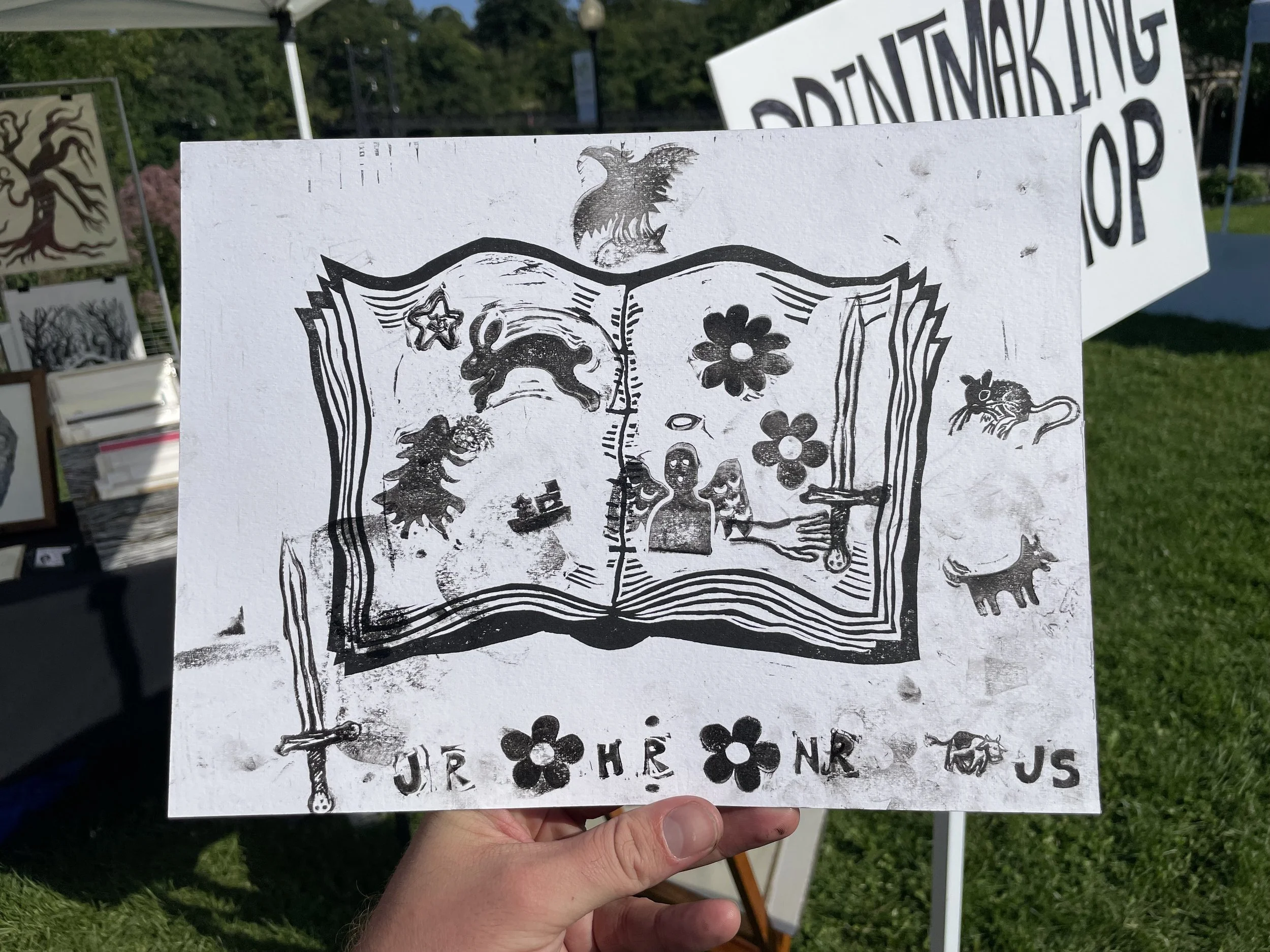 In this workshop, participants choose from a selection of stamps hand carved by James Sylvester, including a full alphabet, and use it to fill in the blank “pages” of a woodcut print of an open faced book.