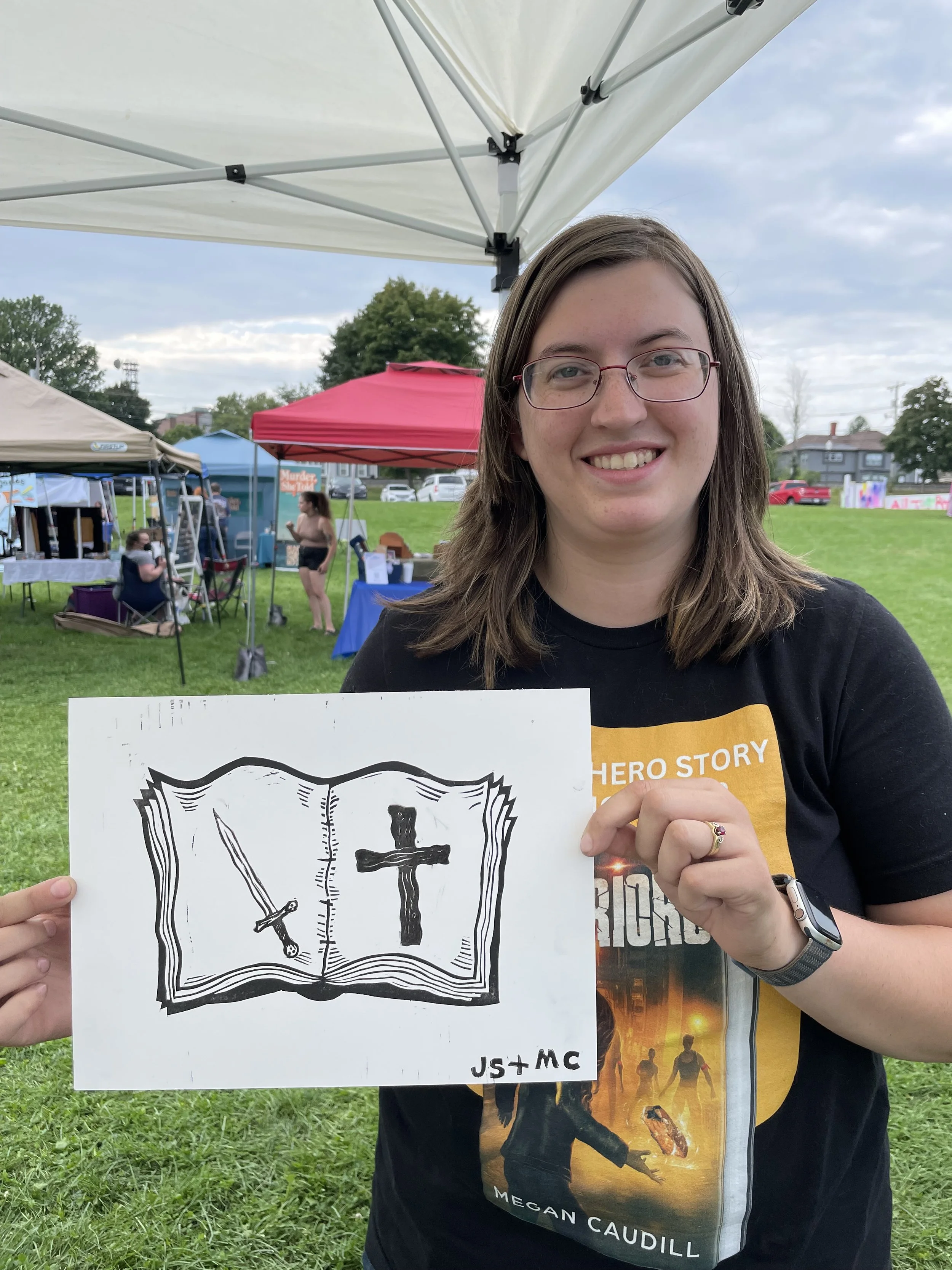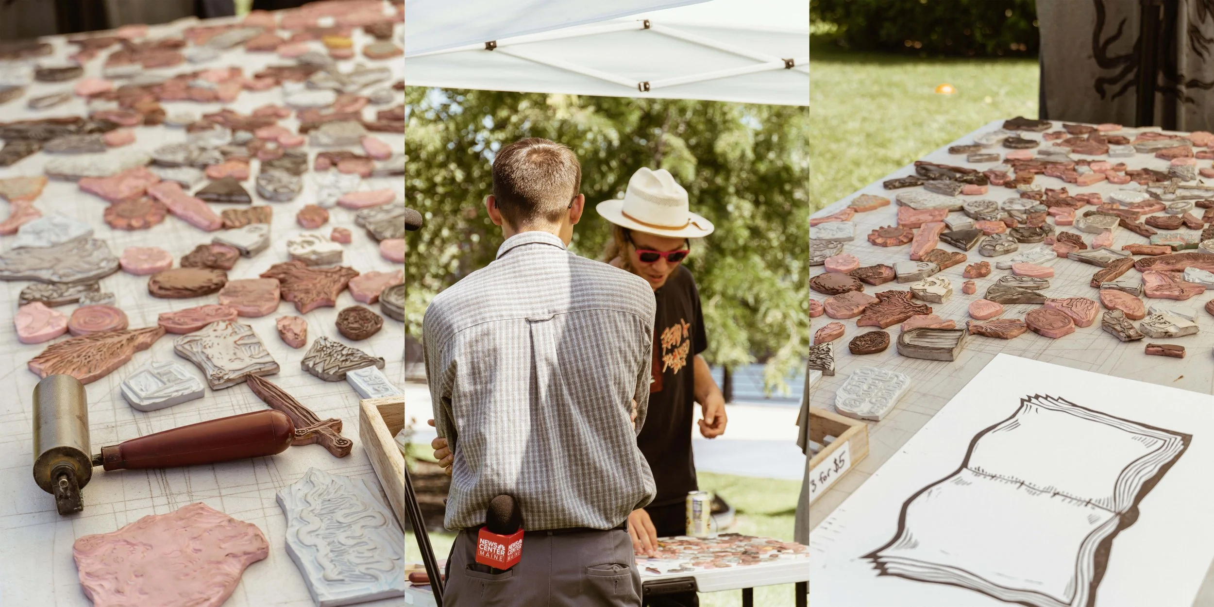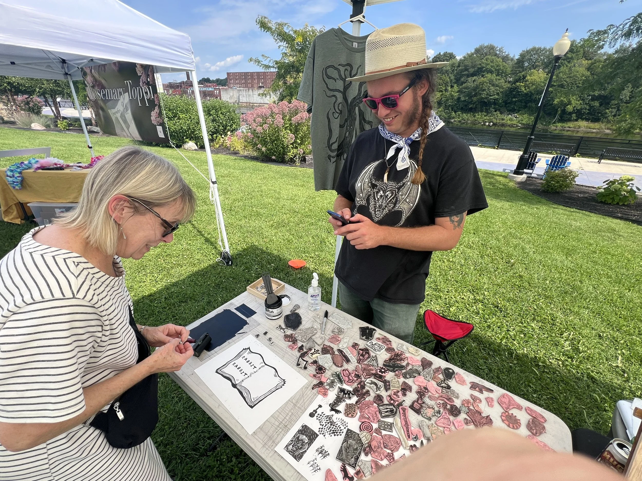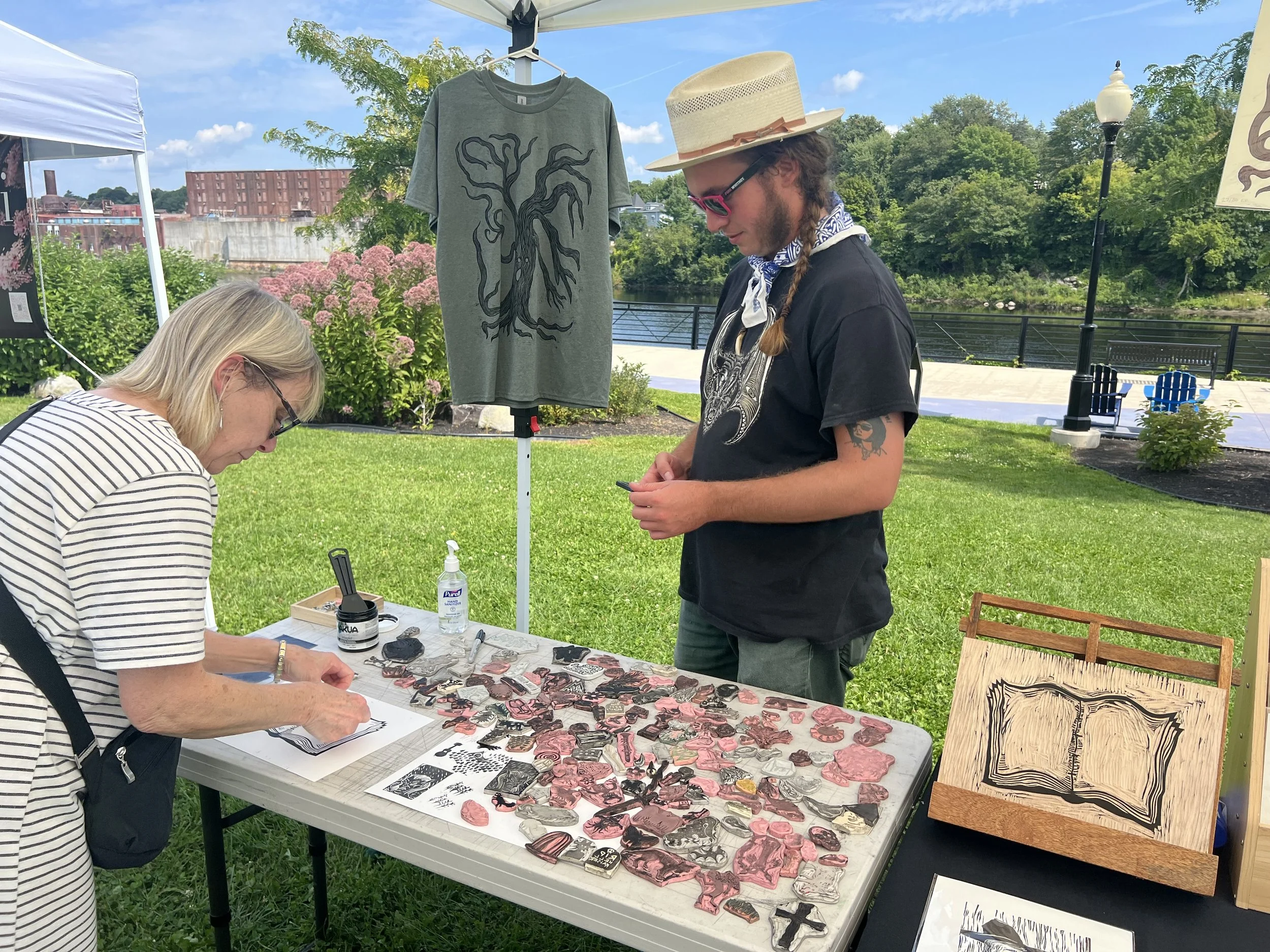 In this workshop, participants choose from a selection of stamps hand carved by James Sylvester, including a full alphabet, and use it to fill in the blank “pages” of a woodcut print of an open faced book.